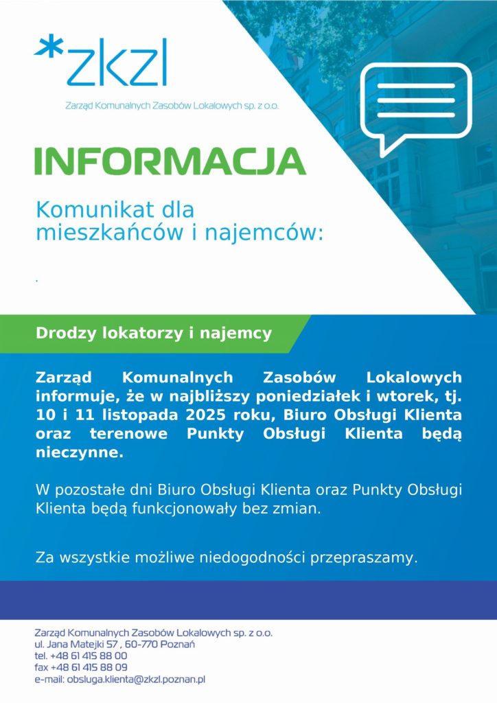 Zarząd Komunalnych Zasobów Lokalowych informuje, że w najbliższy poniedziałek i wtorek, tj. 10 i 11 listopada 2025 roku Biuro Obsługi Klienta oraz terenowe Punkty Obsługi Klienta będą nieczynne.