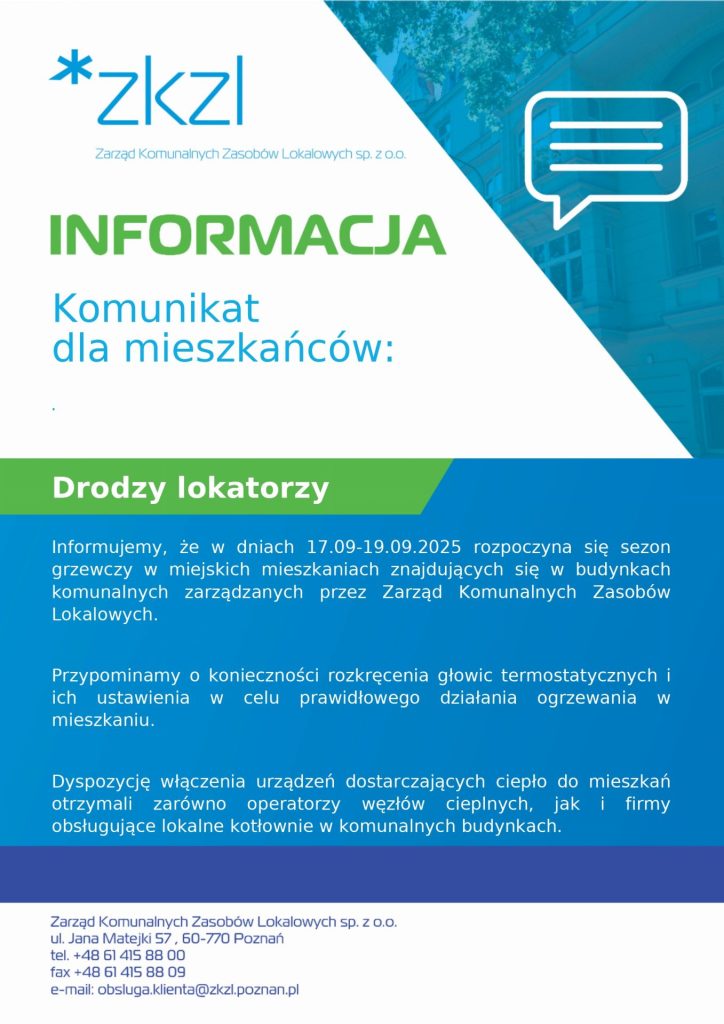 Zarząd Komunalnych Zasobów Lokalowych pragnie poinformować, że w dniach 17.09-19.09.2025 zaplanowane jest rozpoczęcie sezonu grzewczego w miejskich mieszkaniach znajdujących się w budynkach komunalnych zarządzanych przez ZKZL.