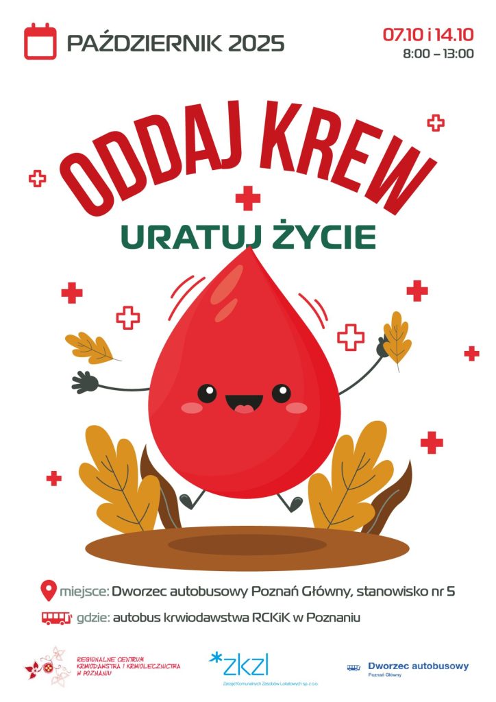Zarząd Komunalnych Zasobów Lokalowych i Regionalne Centrum Krwiodawstwa i Krwiolecznictwa informuje o dwóch wizytach krwiobusa na terenie Dworca autobusowego Poznań Główny w nadchodzącym miesiącu. Chętni będą mogli wspomóc akcje we wtorki 7 i 14 października.